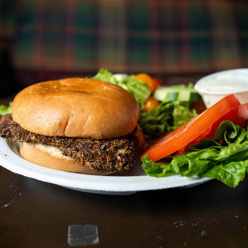 Grilled chicken breast, dry jerk seasoning, lettuce, tomato on a toasted gourmet bun.